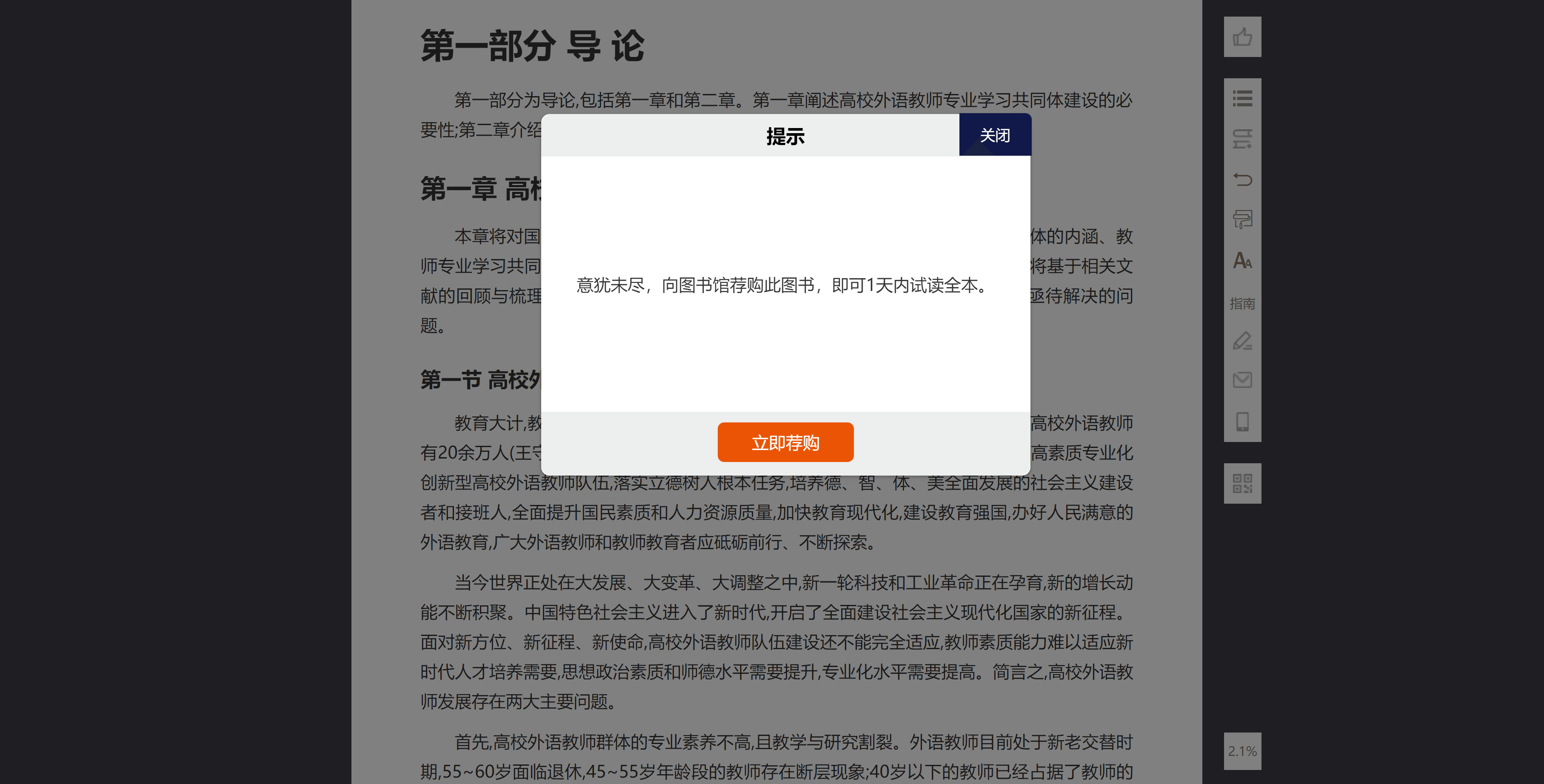 Welcome YiBook Project! 欢迎来到易书计划 :tada:/ 文章/ 可知:国家正版电子书平台,可试读、全文阅读【多个出版社入驻】/ 可知:国家正版电子书平台,可试读、全文阅读【多个出版社入驻】 9 八月 2022·1 分钟 Table of Contents 简介 相关链接 使用教程 全文获取方式 简介 # “可知”平台,是由电子工业出版社、人民邮电出版社、化学工业出版社、机械工业出版社、北京大学出版社等110家知名出版社入驻并直接提供数字资源的知识服务平台。 个人用户可试读,机构用户可通过“荐书”全文阅读。 图书质量非常高,不是扫描版,内容很多。 相关链接 # 可知-国家知识服务平台可知分平台 使用教程 # 个人用户可试读,机构用户可通过“荐书”全文阅读。大学生可以通过CARSI登录。 直接搜索阅读即可。 全文获取方式 # 机构用户通过荐书获取全文。 荐书之后即可获得一天的阅读有效期。 关于下载将在另外的文章中介绍。